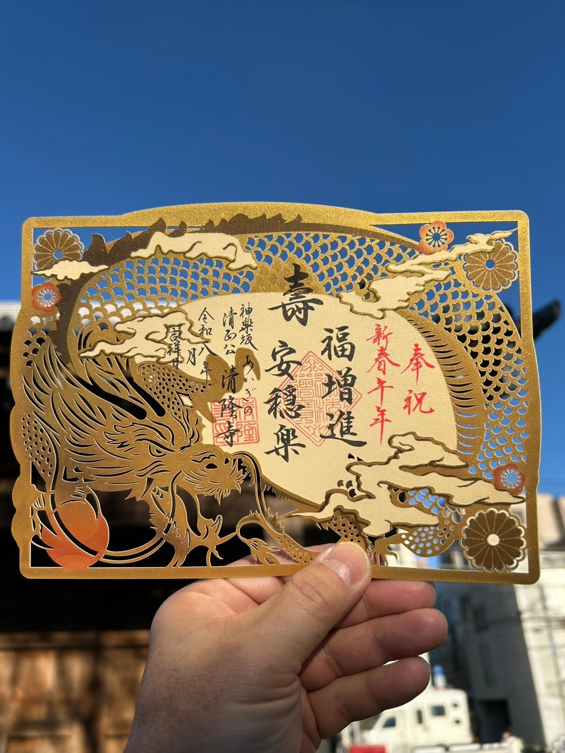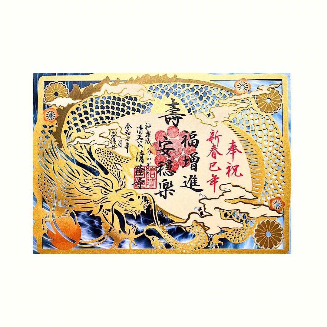 ※手書きの為、写真と商品が必ずしも一致しない場合がございます 新春御朱印として、白富龍王神の金色バージョンをご紹介いたします。 金色に輝く龍神様が描かれたデザインは、新たな一年の繁栄と守護を願う縁起の良い御朱印です。 この機会にぜひお参りいただき、新しい年の幸運をお受けください。