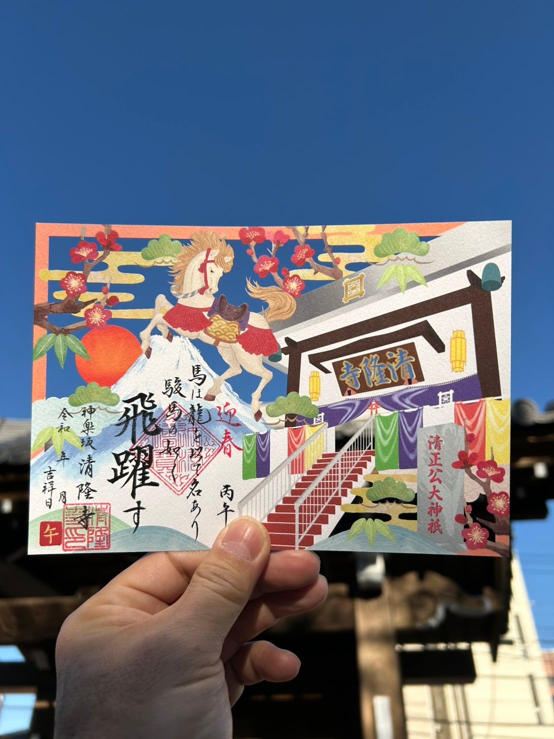 新春御朱印として、富士山、干支の午(うま)、梅をモチーフにした新年を祝うおめでたい切り絵御朱印「吉祥 富士と午(うま)と梅」をご紹介します。