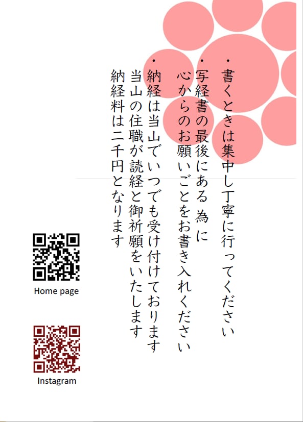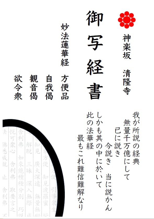 為書き 誰のために、何のために写経をしたか 清隆寺まで送り返していただければ、 読み上げをして奉納いたします。 3枚セット 法華経 二 法華経 十六 法華経 二十五 前半の中心が2番 全体の中でも大切な16番 25番は 厄除け、除災、得幸(とっこう)です。